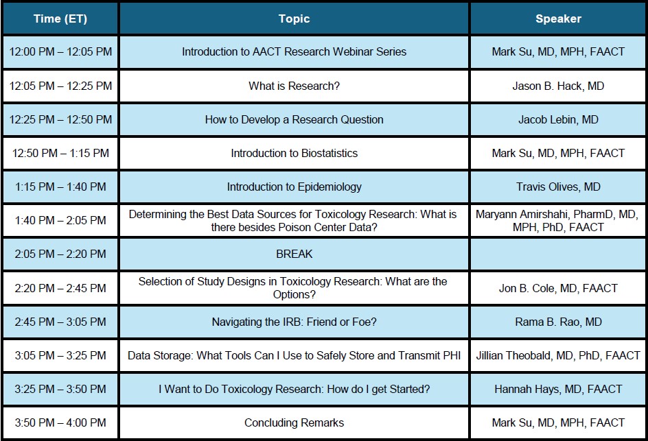 This AACT-Sponsored Educational Seminar is a four-hour virtual seminar targeted for toxicology fellows-in-training and early career toxicologists. Performing and understanding toxicology research can be significantly improved by building a strong foundation in epidemiology, biostatistics and evidence-based medicine. AACT has designed content that addresses these three topics with a toxicology “spin.” Toxicologists with extensive research experience will provide an overview of important concepts in biostatistics, epidemiology, and important research concepts.